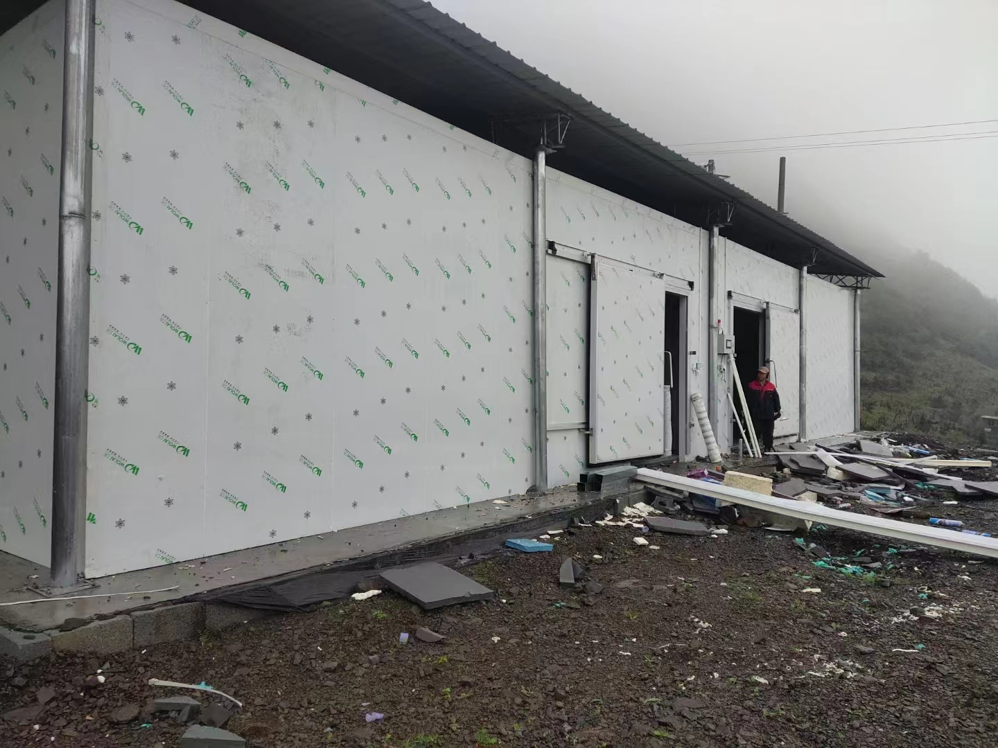 2、冷库库体的安装:500平方的冷库通常以聚氨酯双面彩钢冷库板为主要库体材料,安装以5面体(除地面)组成一个密封的仓储空间,冷库板的安装需用锁钩固定,已达到库体的平整稳固,库体与库体之间的接缝必须打上密封胶,以防止冷桥的形成。